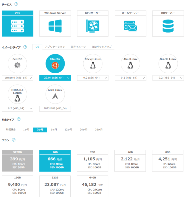 様々なOS・各種ディストリビューションからサーバーを構築できます。また、料金プランも柔軟に選択できます。短期で使用したい場合は「時間課金」がおすすめですが、長期の場合は「3ヵ月」以上のプランがおすすめですね。