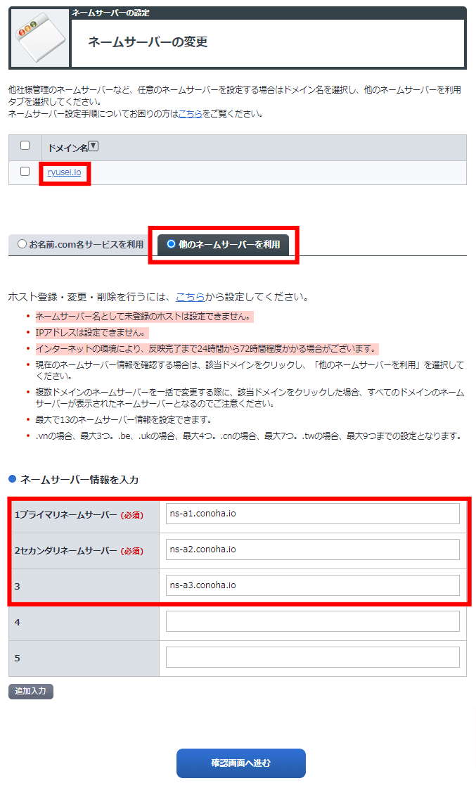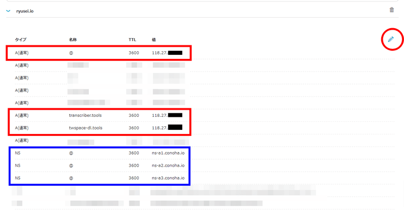 Configure the above settings to route traffic to Conoha VPS's DNS. Since Conoha VPS appears to have three DNS servers, enter ns-a1.conoha.io