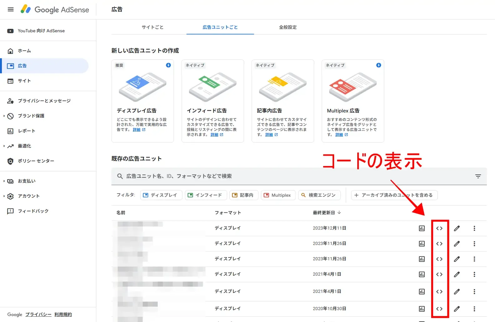 Access your AdSense dashboard and click the "Ads" → "By Ad Unit" tab in the left menu. This will display all previously created ad units below. If you don't have any created ad units yet, create a new one by selecting "Display Ad" in the "Create a New Ad Unit" section.
